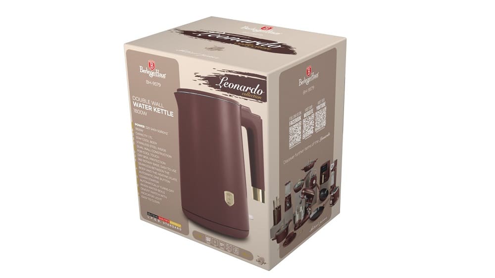 Uronite u bezvremensku eleganciju kuhala za vodu Berlinger Haus BH9579 Leonardo s dvostrukim zidom. Svojom mat bordo bojom i elegantnim dizajnom, ovo kuhalo za vodu prekrasan je dodatak svakoj kuhinjskoj radnoj površini, podižući vaše iskustvo kuhanja čaja na viši nivo svojom elegantnom estetikom.