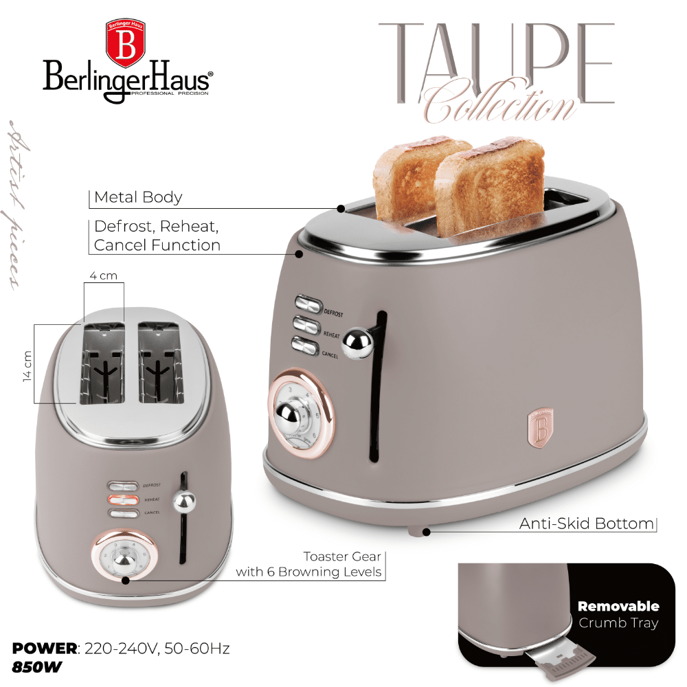 🍞 Berlinger Haus BH9518 Toster za 2 kriške u boji Taupe – Elegantna preciznost, svakodnevne performanse