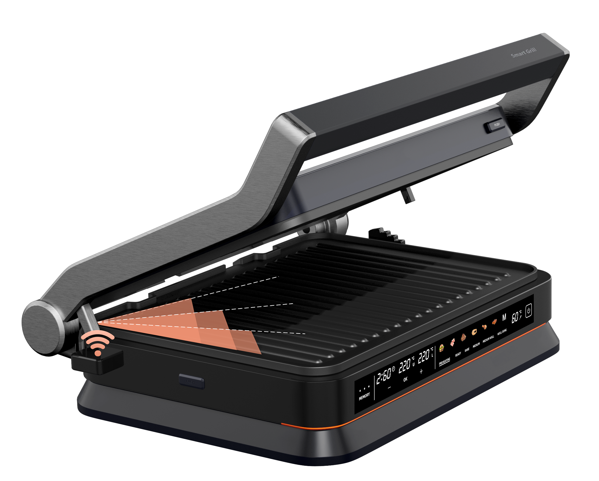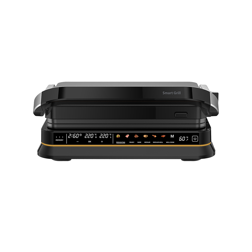 VIVAX Smart Grill SM-2100S GB donosi novo iskustvo pečenja i kuhanja zahvaljujući pametnim funkcijama i elegantnom dizajnu koji uključuje crni stakleni pokrov. Snažan grijač od 2100 W i velika površina ploča od 33 × 24,4 cm omogućuju pripremu većih komada mesa, povrća ili sendviča, dok mogućnost potpunog rasklapanja pretvara uređaj u praktičan stolni roštilj s dvostruko većom površinom. Pametni senzor prepoznaje debljinu mesa i automatski prilagođava način pečenja, a dodatna temperaturna sonda omogućuje precizno mjerenje unutarnje temperature za savršene rezultate. Na digitalnom LED zaslonu moguće je odabrati vrijeme pećenja i vrstu mesa, pa čak i razinu pečenosti, dok se temperatura gornje i donje ploča može ugađati zasebno. Sve postavke moguće je spremiti u tri memorije, što omogućuje brzi odabir pri svakom sljedećem korištenju. Uz neljepljive odvojive ploče čišćenje je jednostavno i brzo, a moderan dizajn s preglednim pokrovom čini ga savršenim dodatkom svakoj kuhinji. VIVAX Smart Grill SM-2100S GB idealan je za brze obroke, ali i za oz biljno kulinarsko uživanje – svaki put uz savršeno pečene zalogaje.